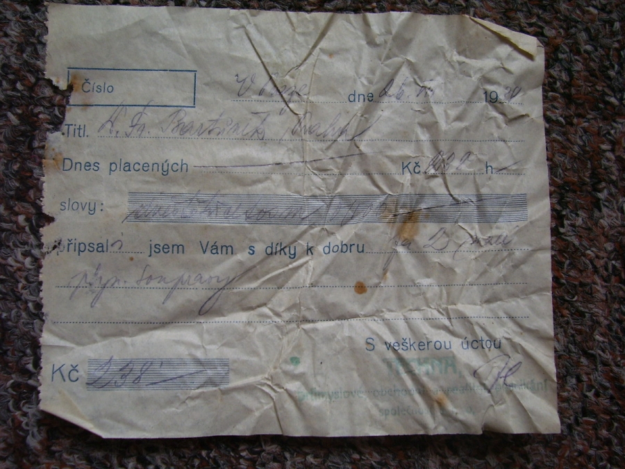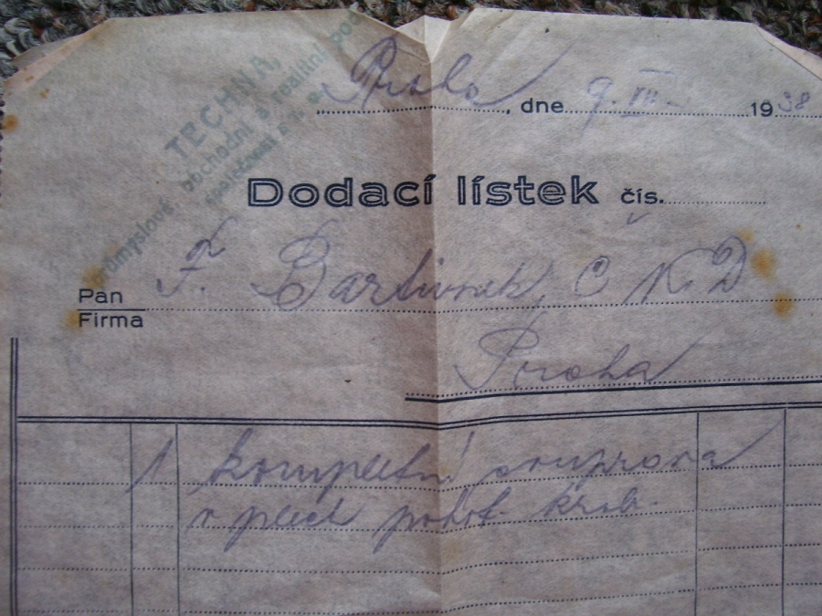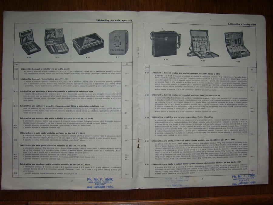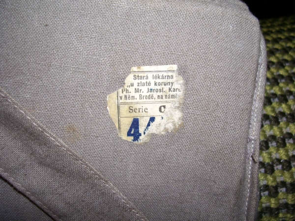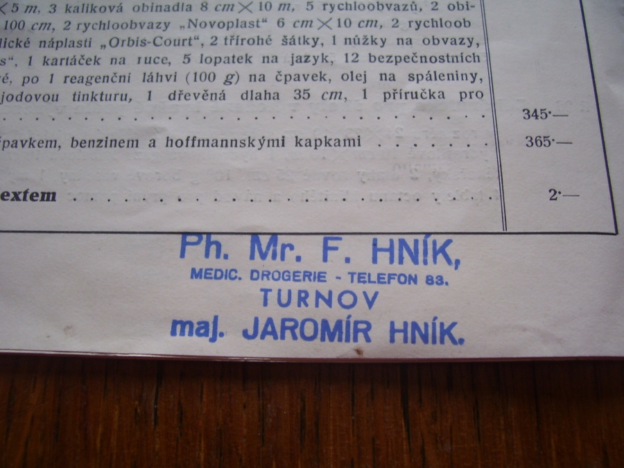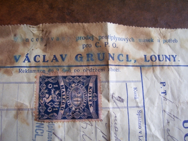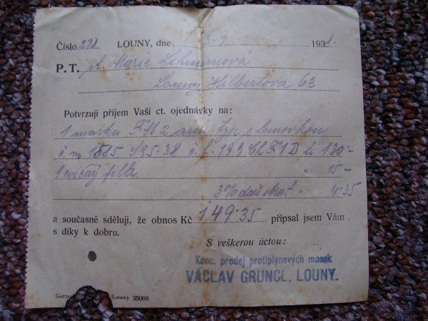Fotografie prospektů a prodejních paragonů kde jsou razítka prodejců plynových masek a potřeb C.P.O.