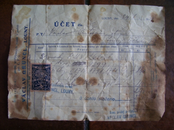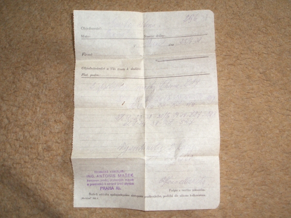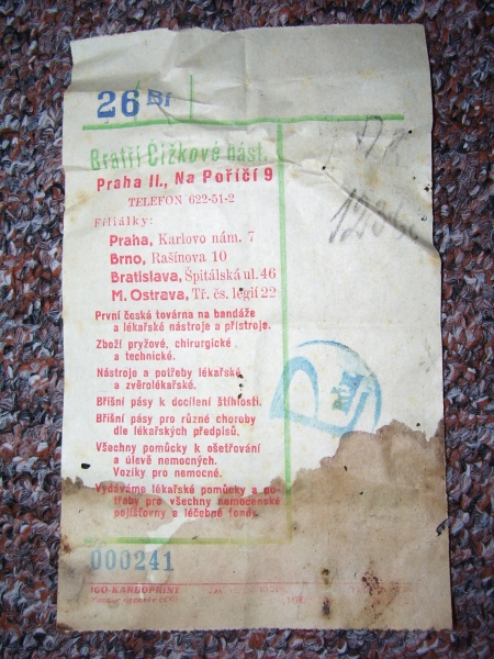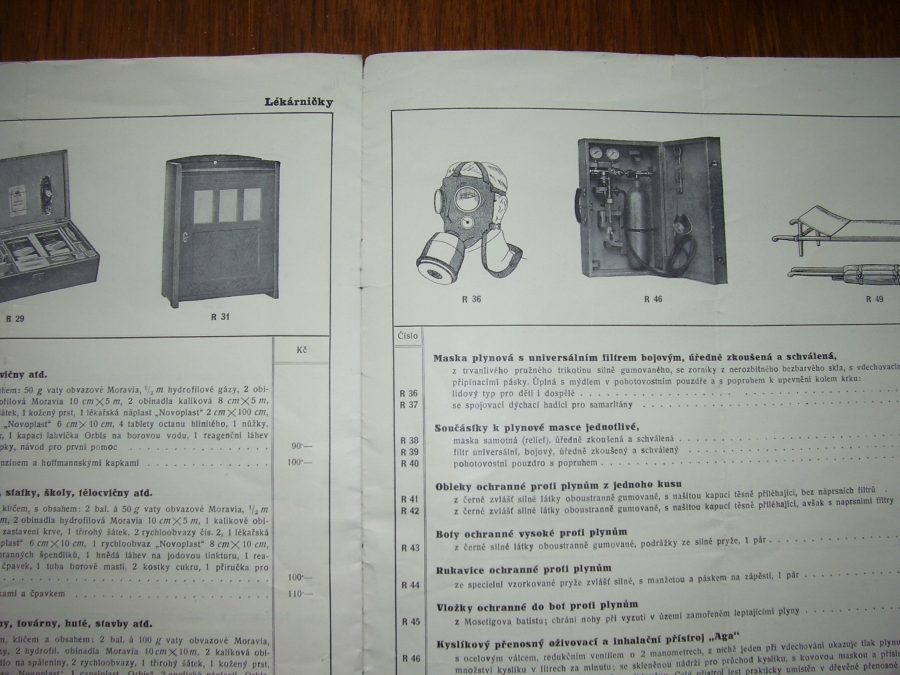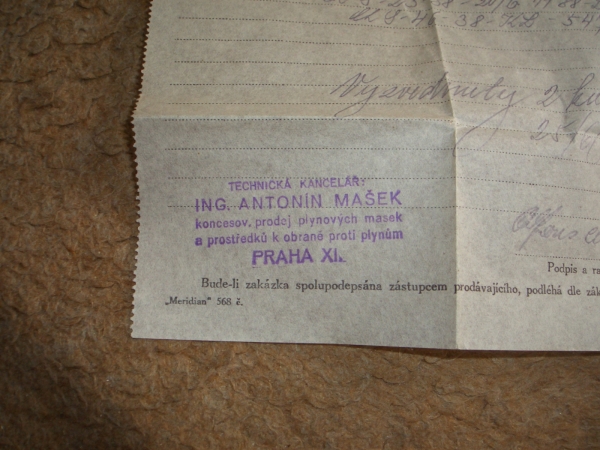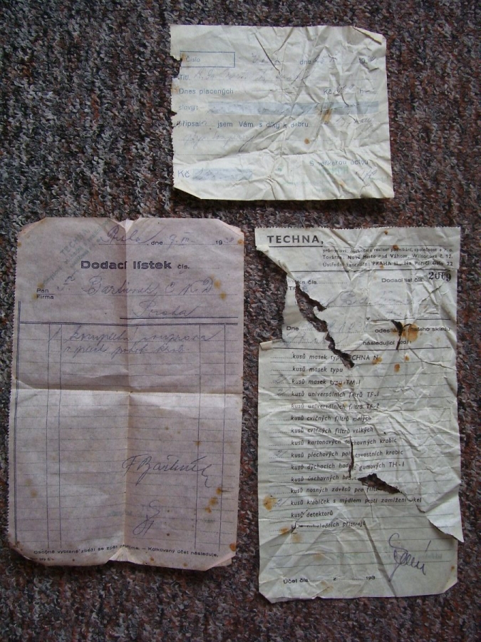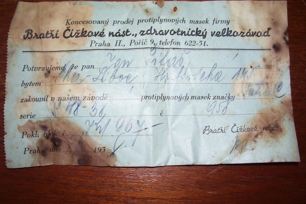 Fotografie prospektů a prodejních paragonů kde jsou razítka prodejců plynových masek a potřeb C.P.O.